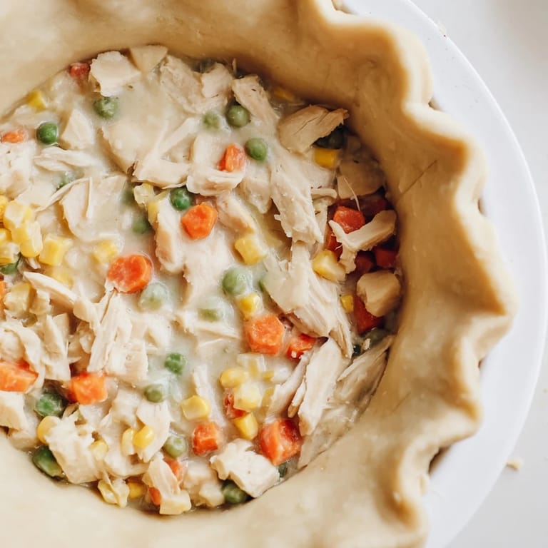 You can make the filling up to a day in advance and refrigerate it in your pie dish, ready to top with dough and bake when you need dinner. This turns a seemingly involved recipe into something you can slide into the oven after a long workday. If baking straight from cold, add 5 extra minutes to the baking time so the filling heats through properly.